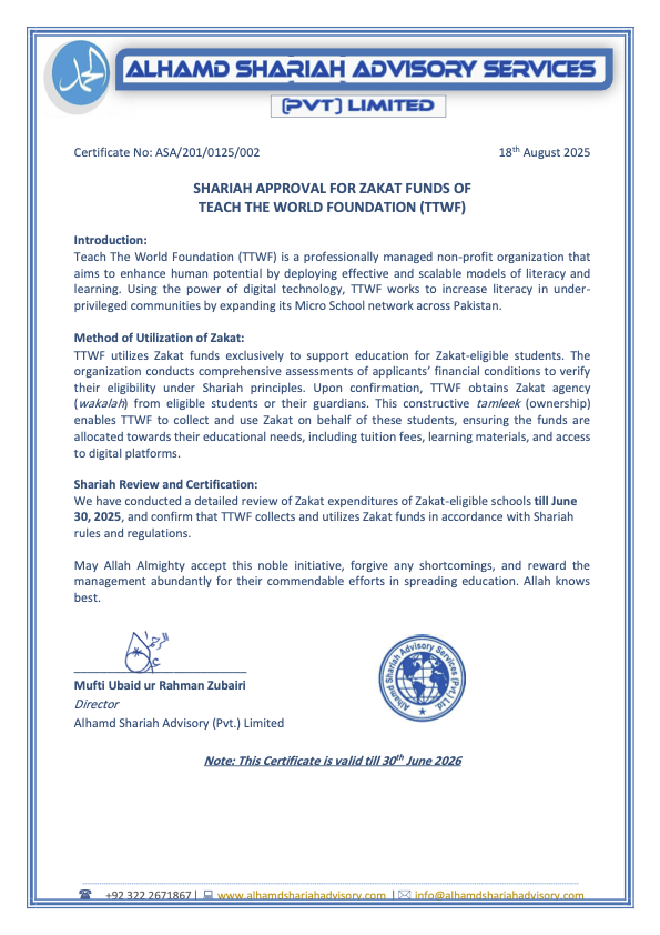 For donations:donations@teachtheworld.org. WhatsApp:+92 320 305 9241